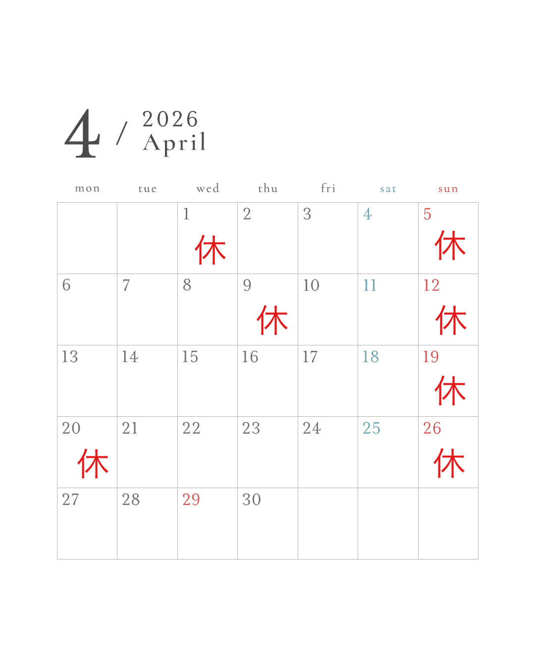 4月カレンダー 2026 3/29 Uncategorized 2026年3月29日 1日(水)のお昼はお休みさせていただきます。夜は前日(3/31)までにご予約いただけましたら営業させていただく予定です! 尚、6日のお昼は貸し切りとなっております。 Uncategorized 3月カレンダー 関連記事 3月カレンダー 2026年2月26日 レモンのプリン白ワイン風味ローズマリーのアイスクリーム添え 2026年2月12日 2月カレンダー 2026年1月31日 苺のゼリー 2026年1月15日 2025年12月28日 2026年1月カレンダー更新しました。 2025年12月21日 12月カレンダー 2025年11月28日 カキのグラタン 2025年11月18日