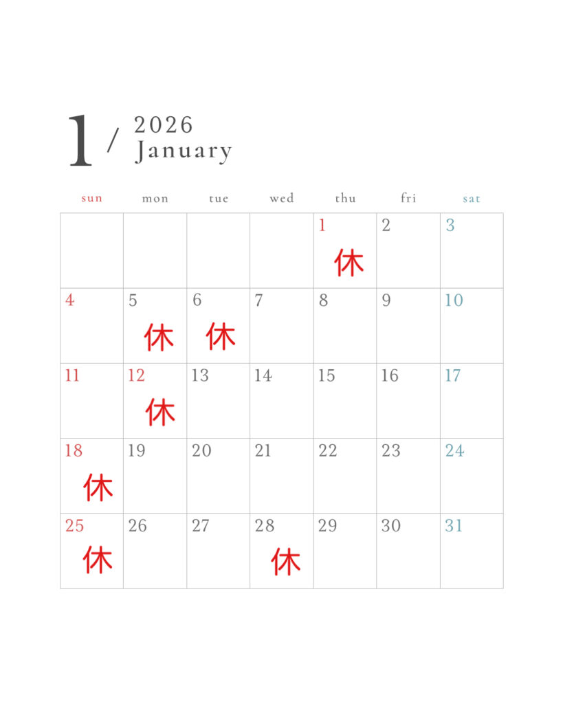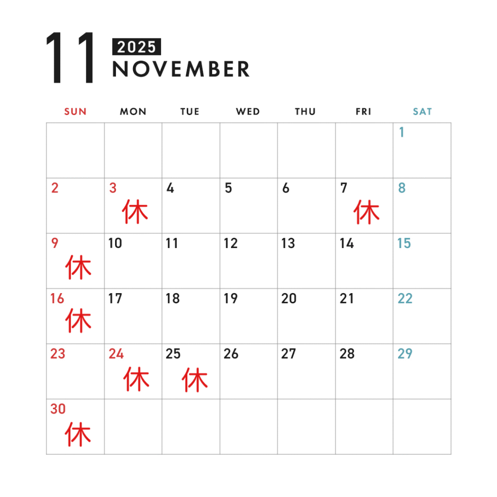 11月の営業カレンダー更新しました。11月は3連休が2回ありますので、2日・23日は日曜日ですが営業いたします。代わりに翌日3日・24日の祝日月曜日がお休みです。平日休みは7日・25日です。 -